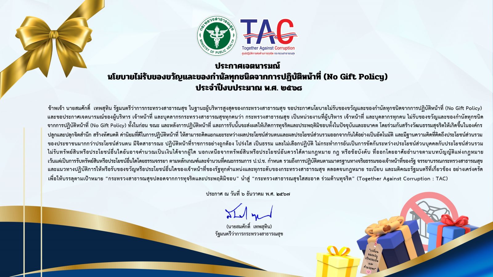 โรงพยาบาลบัวลายขอประกาศเจตนารมณ์นโยบายไม่รับของขวัญและของกำนัลทุกชนิดจากการปฏิบัติหน้าที่(No Gift Policy) ประจำปีงบประมาณ พ.ศ. 2568 เผยแพร่เมื่อ: 24 กุมภาพันธ์ 2568