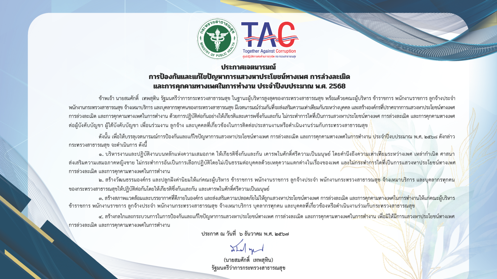โรงพยาบาลบัวลายขอประกาศเจตนารมณ์การป้องกันและแก้ไขปัญหาการแสวงหาประโยชน์ทางเพศ การล่วงละเมิด และการคุกคามทางเพศในการทำงาน ประจำปีงบประมาณ พ.ศ. 2568 เผยแพร่เมื่อ: 26 มีนาคม 2568